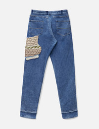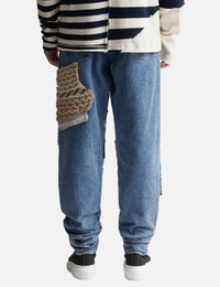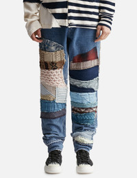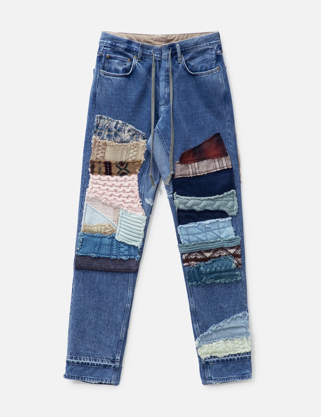 - GREG LAUREN - Denim Sweater 34 Lounge Pants - Button fly - Drawstring waistband - 5 pocket styling - Straight leg - Wool patchwork accent on front - Drawcord at waist - Ribbed ankles - Color: Denim Blue - Material: 95% Cotton, 5% Wool - See more Jeans and Clothing SIZING - Model wears size 2 - Model measures: Height 186cm, Chest 35”/89cm, Waist 30.5”/78cm, Hip 35.5”/91cm
