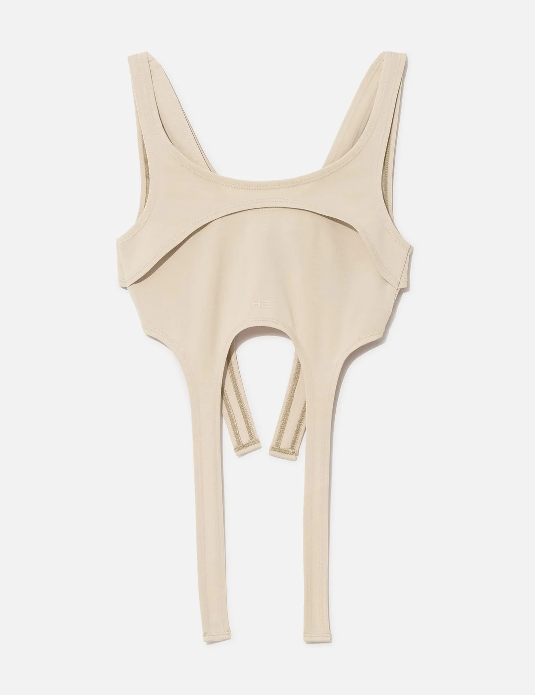 - Heliot Emil - Harness Top - Stretchy construction - Layered design - Sleeveless - Harness with g-hook closure at back - Deep back - Color: Beige - Material: 92% Polyester, 8% Spandex - See more Tops and Clothing - Vendor Code: HE_W_13_005_P03_BE16