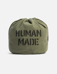 - Human Made - Drawstring Bag - Washed cotton fabric - Drawstring closure - Logo print at front and rear - Color: Olive Drab - Material: 100% Cotton - See more Shoulder Bags, Bags and Accessories SIZING Approximate dimensions: - Height: 19cm - Depth Diameter: 16cm