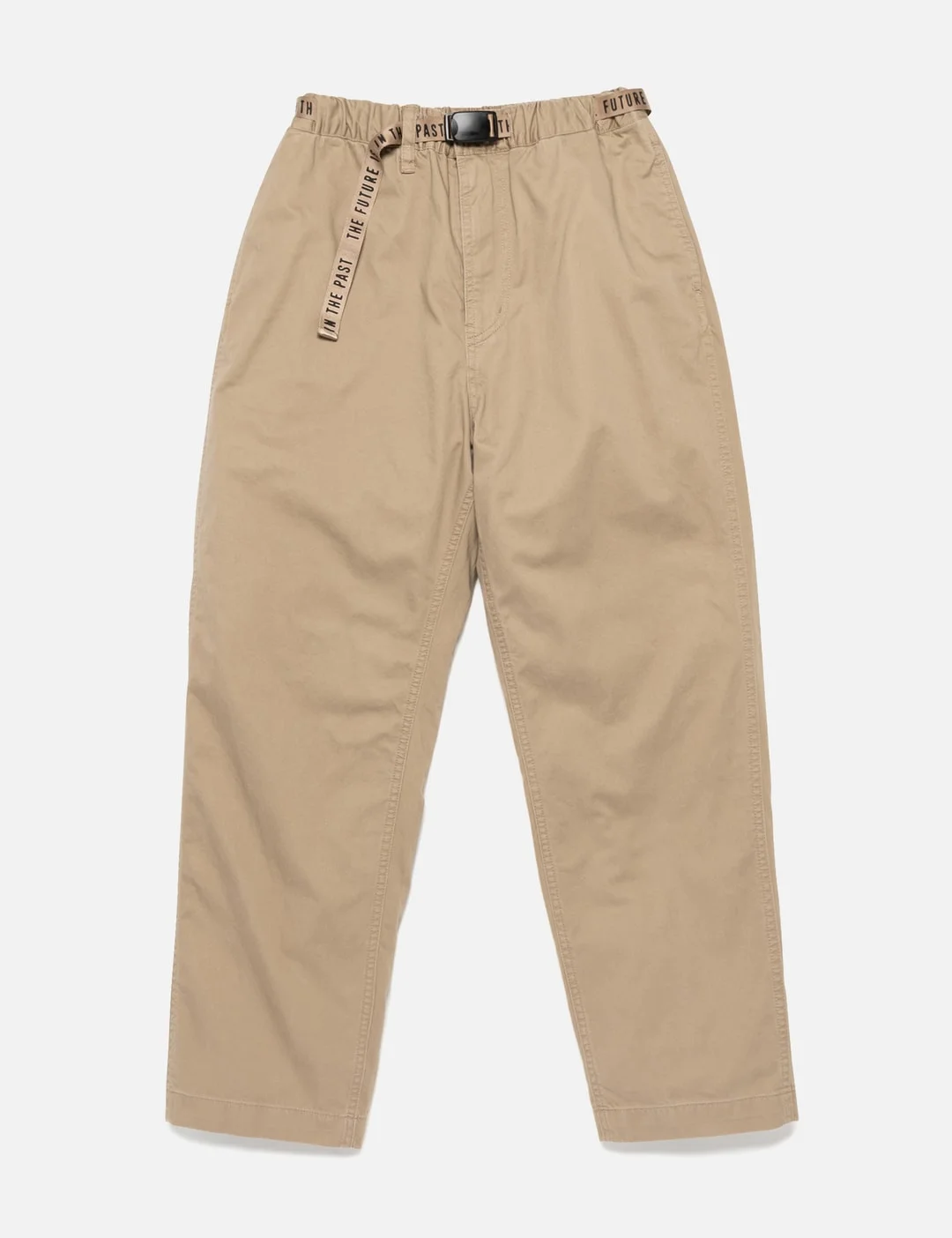 - Human Made - Easy Pants - Shiny cotton twill exterior - Relaxed fit - Elasticated waistband - Webbing belt with logo print - Zip fly - Two side pockets - Two back pockets on the right leg; branded label on the bottom - Tapered legs - Color: Beige - Material: 100% Cotton; Belt: 100% Nylon - See more Pants and Clothing - Vendor Code: HM30PT012