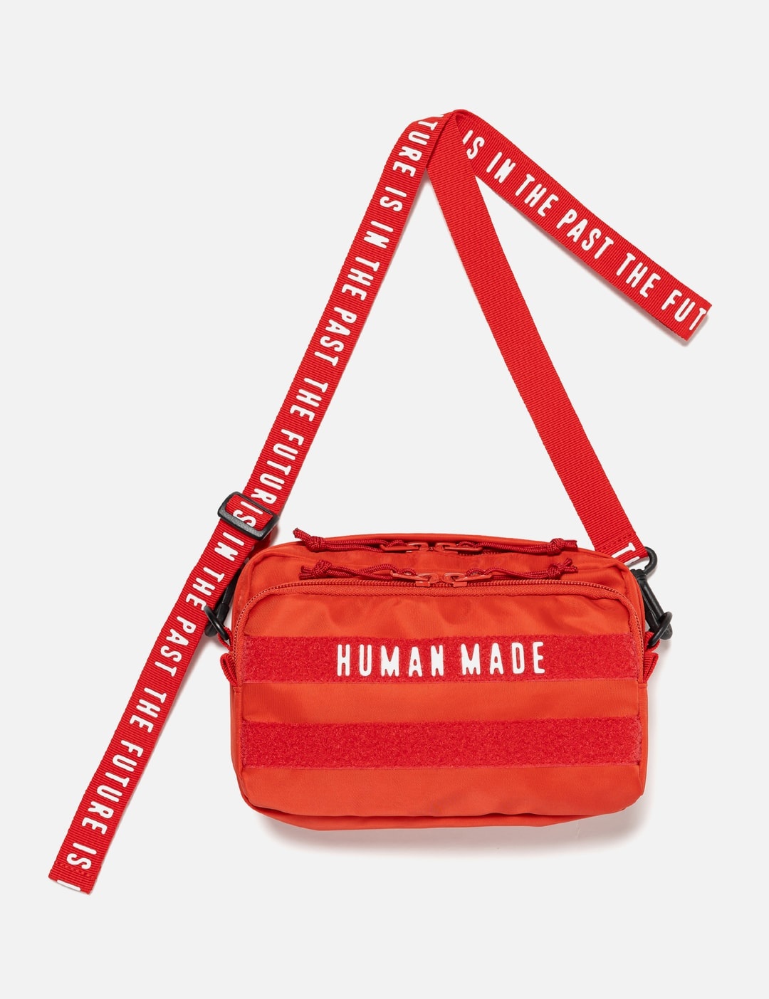 - Human Made - Military Pouch Small - Printed branding on front magic tape closure - Removing the magic tape on the front to reveal text - 3 zipper closure compartments - Inner pocket in the main compartment - Adjustable and detachable shoulder strap with printed logo - Color: Red - Material: 100% Nylon - See more Cross-Body Bags, Bags and Accessories SIZING Approximate dimensions: - Height: 14cm - Width: 21.5cm - Depth: 5cm - Strap Length: 61cm