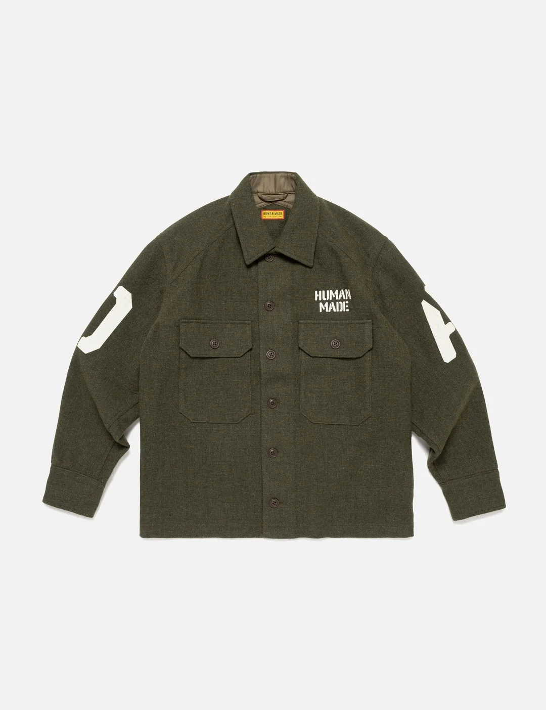 - Human Made - Military Shirt - Vintage-inspired design - Made of a wool blend ripstop fabric - Pre-washed soft texture - Front button closure - Stencil-style graphics on the sleeves, left chest and back - Rubber graphic printing - Two flap pockets on the front - Color: Olive Drab - Material: 74% Wool, 24% Polyester, 1% Nylon, 1% Acrylic; Lining: 100% Polyester - See more Shirts and Clothing - Vendor Code: HM30SH008