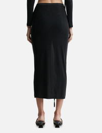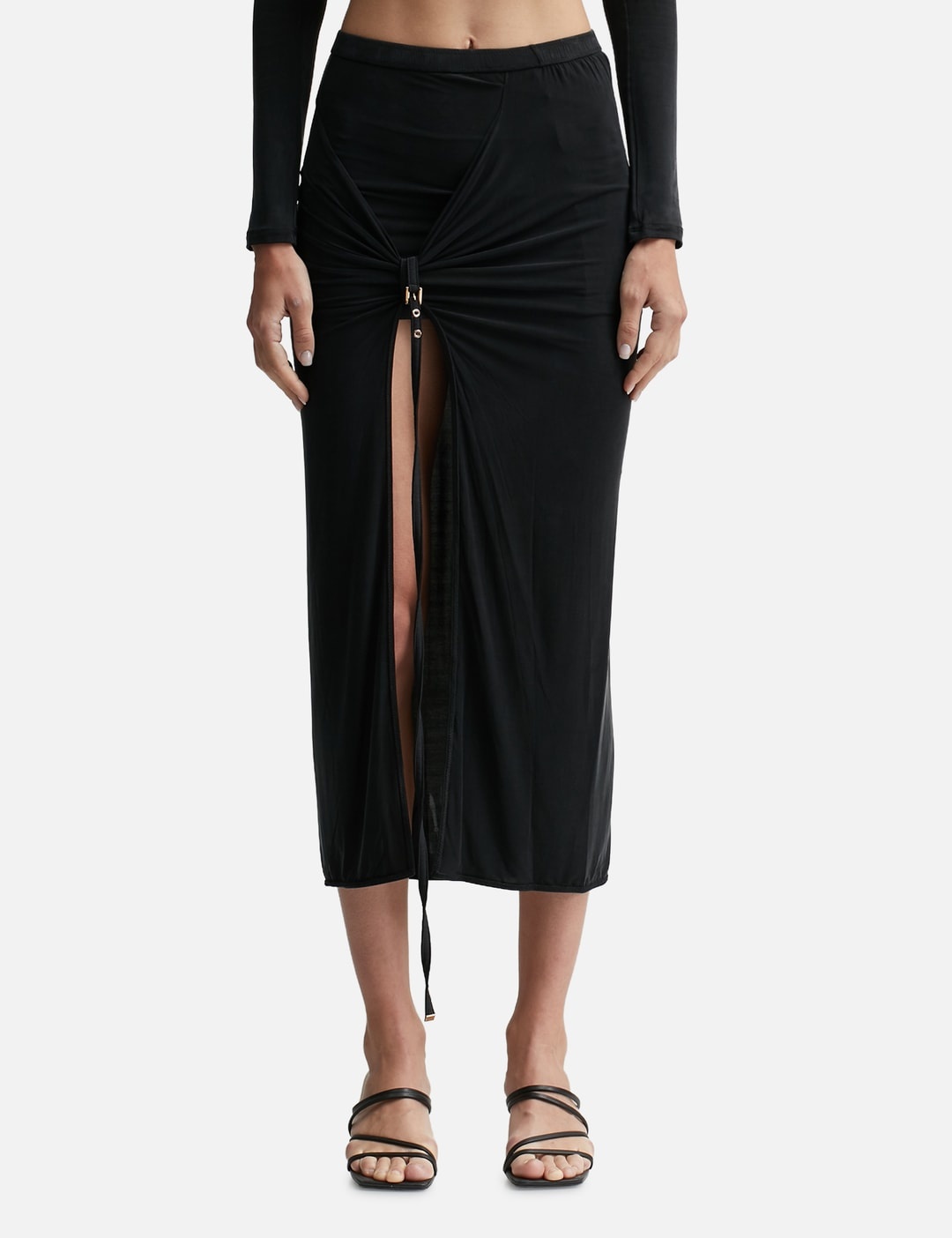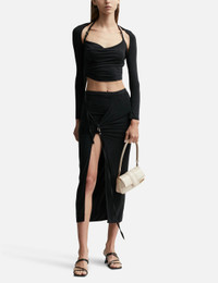- Jacquemus - La jupe pareo Croissant - Slit sarong skirt - Low rise - Straight midi fit - Asymmetric gathered waist - Long side slit - Decorative knot with golden metal buckle - Color: Black - Material: 93% Cupro, 7% Elastane - See more Skirts and Clothing SIZING - Model wears size S - Model measures: Height 180cm, Chest 32.6”/83cm, Waist 23.2”/59cm, Hip 35”89cm