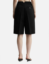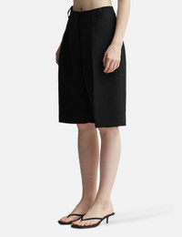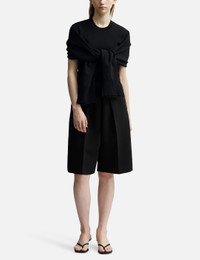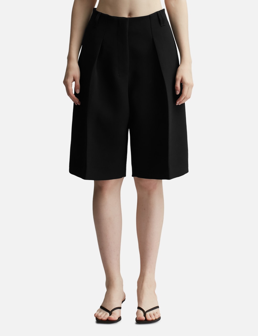 - Jacquemus - Le bermuda Ovalo - Curved bermudas - High-waisted - Curved fit - Belt loops - Split waistband in the back - Hidden zip and button closure - Back welt pocket with "J" button loop - Pressed pleats - Made in Bulgaria - Color: Black - Material: 100% Polyester; Lining: 97% Cotton, 3% Elastane - See more Shorts and Clothing SIZING - Model wears size 36 - Model measures: Height 186cm, Chest 34”/86cm, Waist 28”/71cm, Hip 36”/91cm