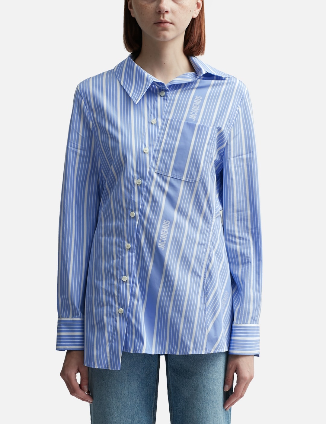 - Jacquemus - The Pablo shirt - Made of striped cotton poplin - Asymmetric design - Straight fit - Jacquard Business logos - Asymmetric pointed collar and button placket - “J” shaped patch pocket - Asymmetric hem - Back yoke with “J” locker loop - Mother-of-pearl buttons - Made in Bulgaria - Color: Jacquard Blue/ White - Material: 100% Cotton - See more Shirts and Clothing SIZING - Model wears size 36 - Model measures: Height 177cm, Chest 32”/81cm, Waist 23.5”/59.7cm, Hip 33’’/83.8cm