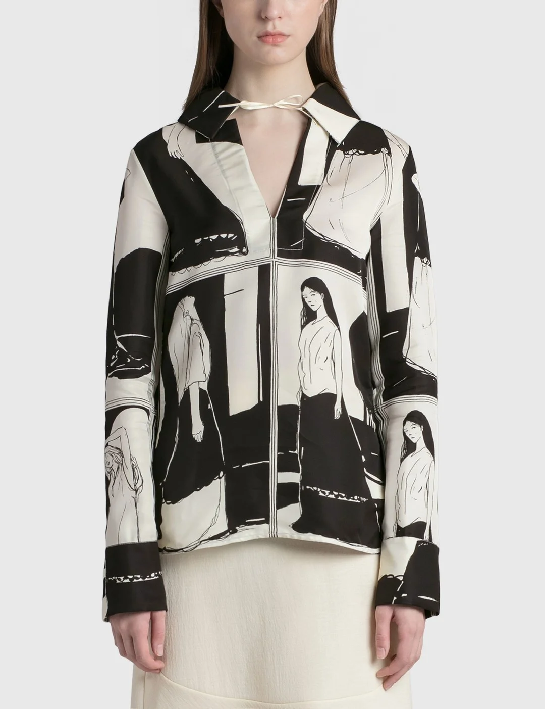 - Jil Sander - Printed Shirt - Printed shirt with tie-closure at collar - Open placket - Concealed button cuffs - Side hem slits - Straight hem - Color: Open White - Material: 64% Viscose, 36% Silk - See more - Shirts - and - Clothing SIZING - Model wears 32 - Model measures: Height 181cm, Chest 33”/84cm, Waist 24”/61cm, Hip 35”/90cm