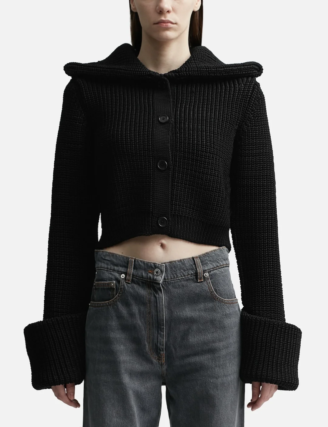- JW Anderson - Chunky Knit Cardigan - Soft poly chunky knit fabric - Oversized collar - Button closure - Roll up cuff - Color: Black - Material: 100% Recycled Polyester - See more Knitwear and Clothing - Vendor Code: KW0789-YN0231 - Model wears size M - Model measures: Height 177cm, Chest 34”/86.36cm, Waist 24’’/60.96cm, Hip35’’/88.9cm