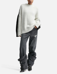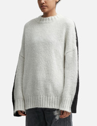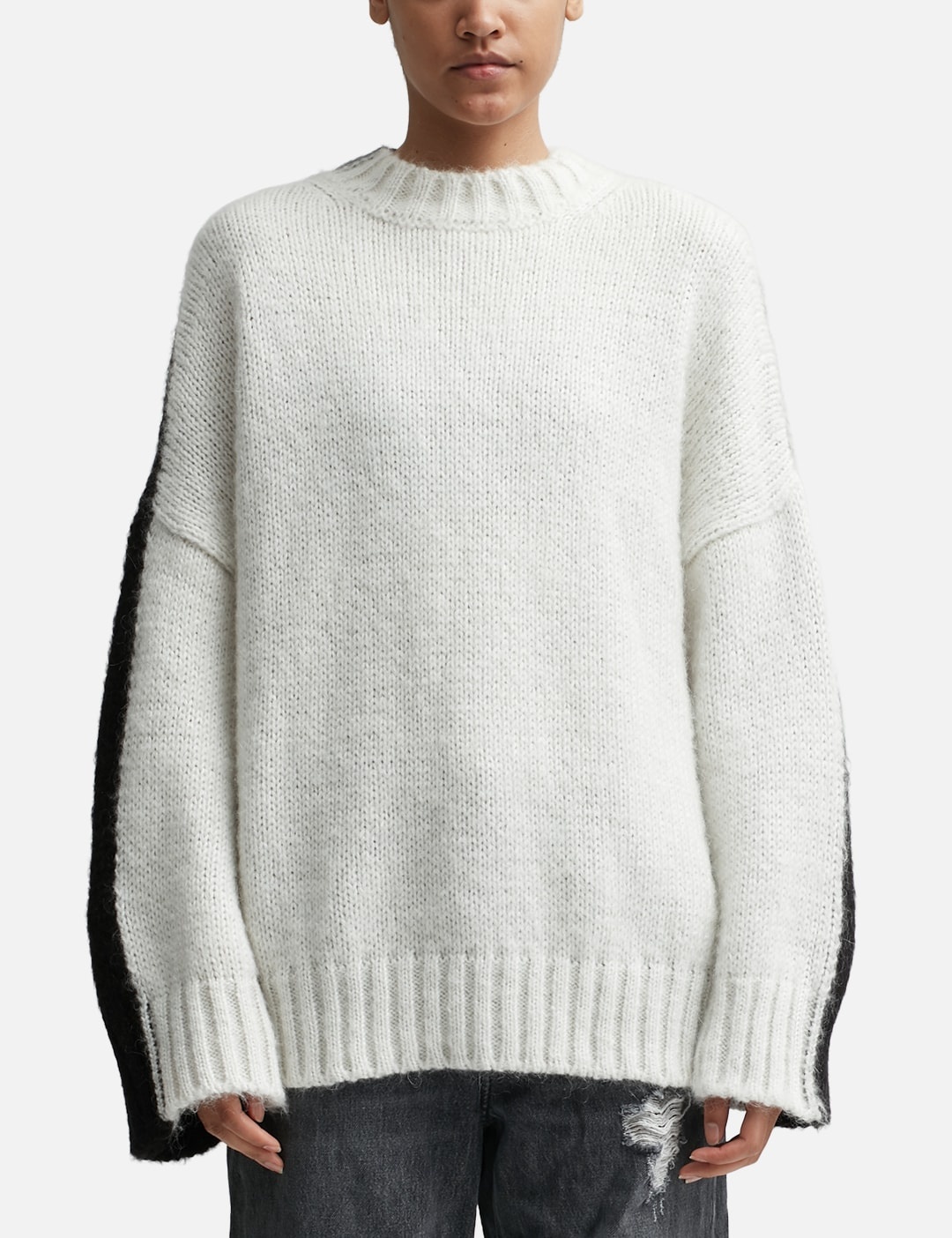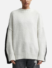 - JW Anderson - Color Block Crewneck Jumper - Oversized fit - Mohair and nylon blend outer - Jersey intarsia stitch - Ribbed crewneck, cuffs, and hem - Low armhole - Dropped shoulder - Two-tone contrast color design - Straight hem - Color: White/Black - Material: 67% Super Kid Mohair, 28% Nylon, 5% Lana - See more Sweatshirts and Clothing SIZING - Model wears size S - Model measures: Height 177cm, Chest 29”/74cm, Waist 23.6”/60cm, Hip 34.6’’/88cm