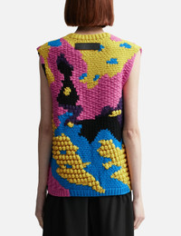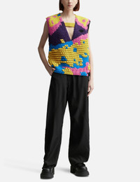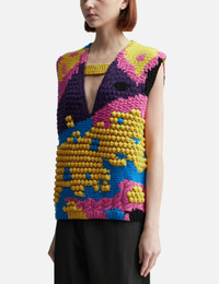 - JW Anderson - Textured V Cut-Out Vest - Made of heavyweight merino extra fine wool - Boxy fit - V-neck - Ribbed collar tab and hem - Logo embossed black leather patch on upper back - Mix of weave, 3D popcorn, jersey, mock rib, and bamboo stick - Hand knit - Color: Bright Yellow - Material: 100% Merino extra fine wool - See more Knitwear and Clothing SIZING - Model wears size S - Model measures: Height 177cm, Chest 32”/81cm, Waist 23.5”/59.7cm, Hip 33’’/83.8cm
