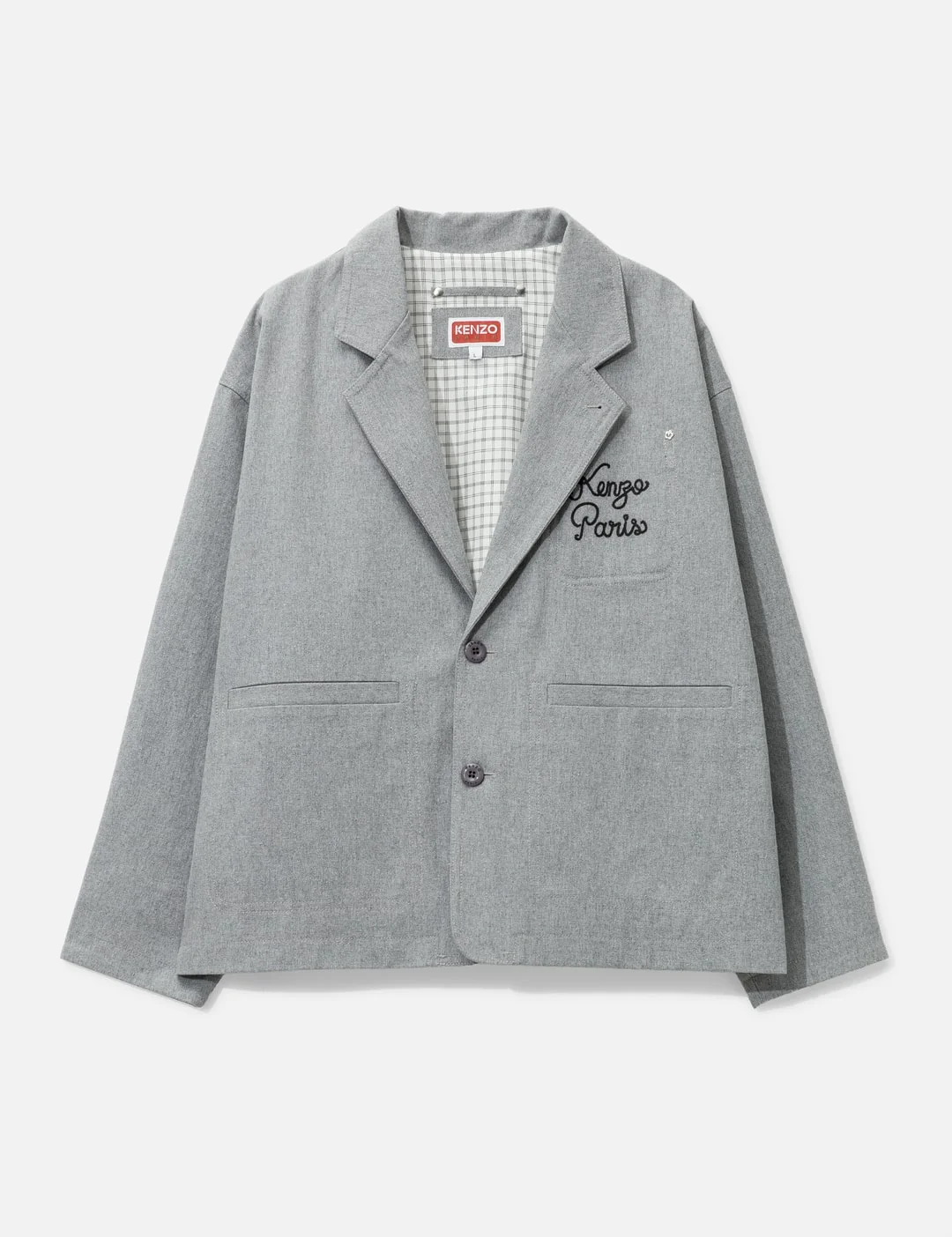 - Kenzo - 'Kenzo Paris Chainstitch' Embroidered Workwear Jacket - Polyester cotton fabric - Boxy fit - Collar button for two-way styling - Chain stitch embroidery on left chest and back - Button closure - Two front pockets - Buttoned cuffs - Color: Pale Grey - Material: 65% Cotton, 25% Polyester, 10% Other Fibers - See more Blazers, Jackets and Clothing - Model wears size M - Model measures: Height 186cm, Chest 34”/86cm, Waist 28”/71cm, Hip 36”/91cm - Model wears size S - Model measures: Height 177cm, Chest 31.9’’/81cm, Waist 23.6’’/60cm, Hip 35.8’’/91cm - Vendor Code: FF65VE2359GV