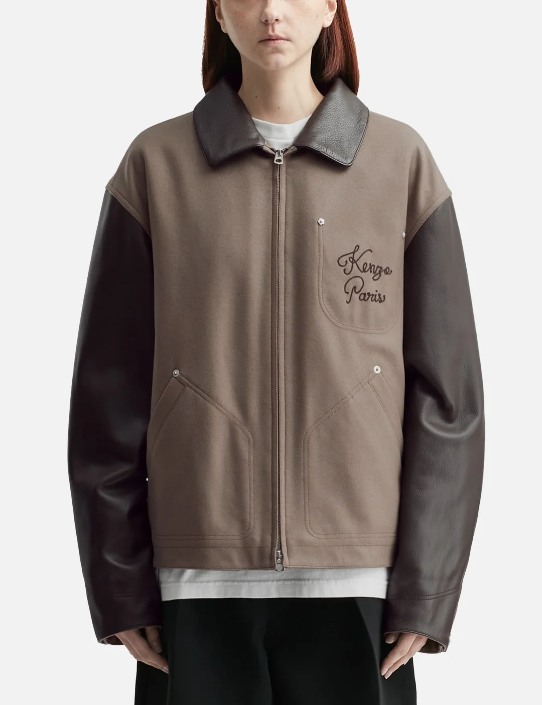 - Kenzo - 'KENZO Paris Chainstitch' Genderless Blouson - Two-tone wool and leather exterior - Relaxed fit - Standard collar - Leather panels on collar and sleeves - Front two-way zip closure - Two side pockets - Interior chest slip pocket - Chain-stitched ‘KENZO Paris’ logo on the chest and back - Side adjusters at hem - Made in Turkey - Color: Taupe - Material: 80% Virgin Wool, 20% Polyamide - See more Bomber Jackets, Jackets and Clothing - Model wears size M - Model measures: Height 186cm, Chest 34”/86cm, Waist 28”/71cm, Hip 36”/91cm - Model wears size M - Model measures: Height 177cm, Chest 32”/81cm, Waist 23.5”/59.7cm, Hip 33’’/83.8cm - Vendor Code: FF68BL1519OH