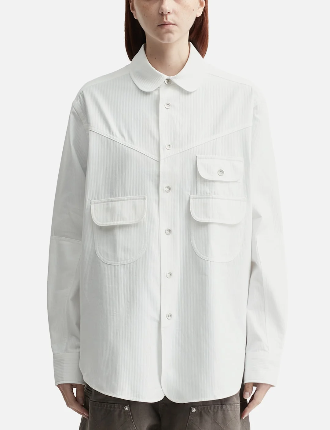 - Kenzo - Workwear Overshirt - Made of textured cotton - Club collar - Button closure - Long sleeves - Three front flap pockets - Logo embroidery below rear neckline - Buttoned cuffs - Curved hem - Color: Off White - Material: 100% Cotton - See more Shirts and Clothing - Model wears size M - Model measures: Height 186cm, Chest 34”/86cm, Waist 28”/71cm, Hip 36”/91cm - Model wears size S - Model measures: Height 177cm, Chest 32”/81cm, Waist 23.5”/59.7cm, Hip 33’’/83.8cm - Vendor Code: FF65CH5369SE