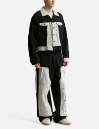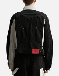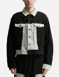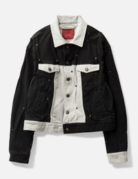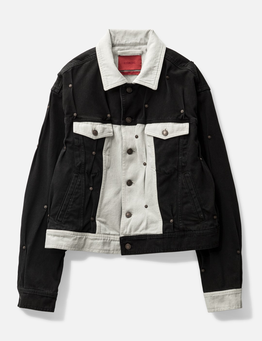 - KUSIKOHC - Multi Rivet Denim Jacket - Spread collar - Allover rivets detail - Flap pockets - Metal button closure - Single-button barrel cuffs - Color: Black and light grey - Country Of Origin: KR - Material: 100% Cotton - See more Jackets and Clothing SIZING - Model wears size M - Model measures: Height 186cm, Chest 34”/86cm, Waist 28”/71cm, Hip 36”/91cm