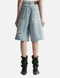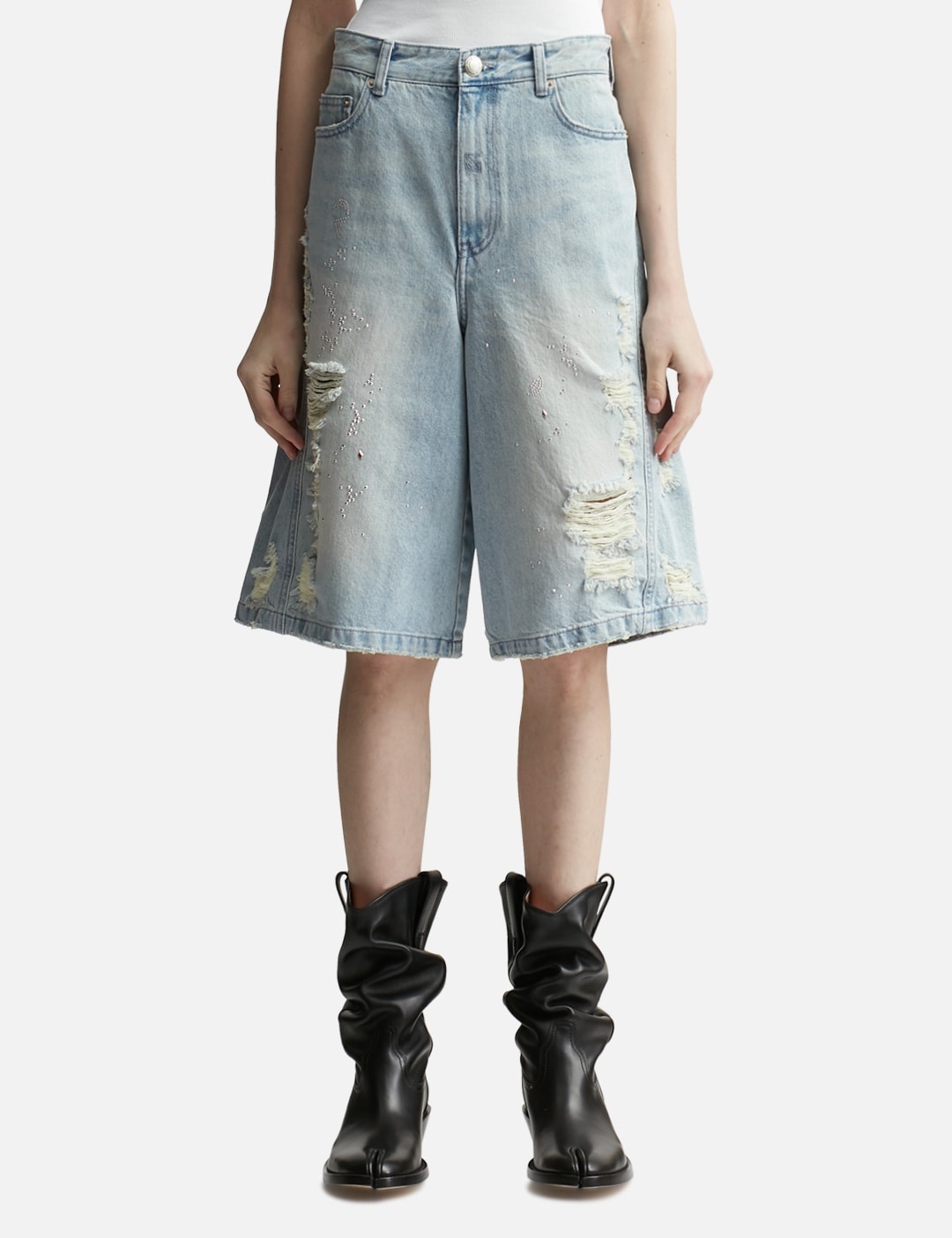 - Lesugiatelier - Crystal-embellished Ripped Denim Shorts - Relaxed fit - Unisex item - Diagonal lines that wrap around the sides - Distressed details following the cut-out lines - Hotfix crystal embellishments at front - Leather logo label on the back waistband - Color: Sky Blue - Country Of Origin: KR - Material: 100% Cotton - See more Shorts and Clothing SIZING - Model wears size 26 - Model measures: Height 177cm, Chest 32”/81cm, Waist 23.5”/59.7cm, Hip 33’’/83.8cm