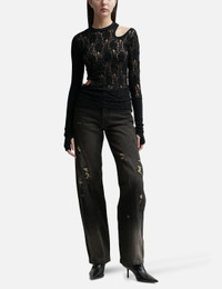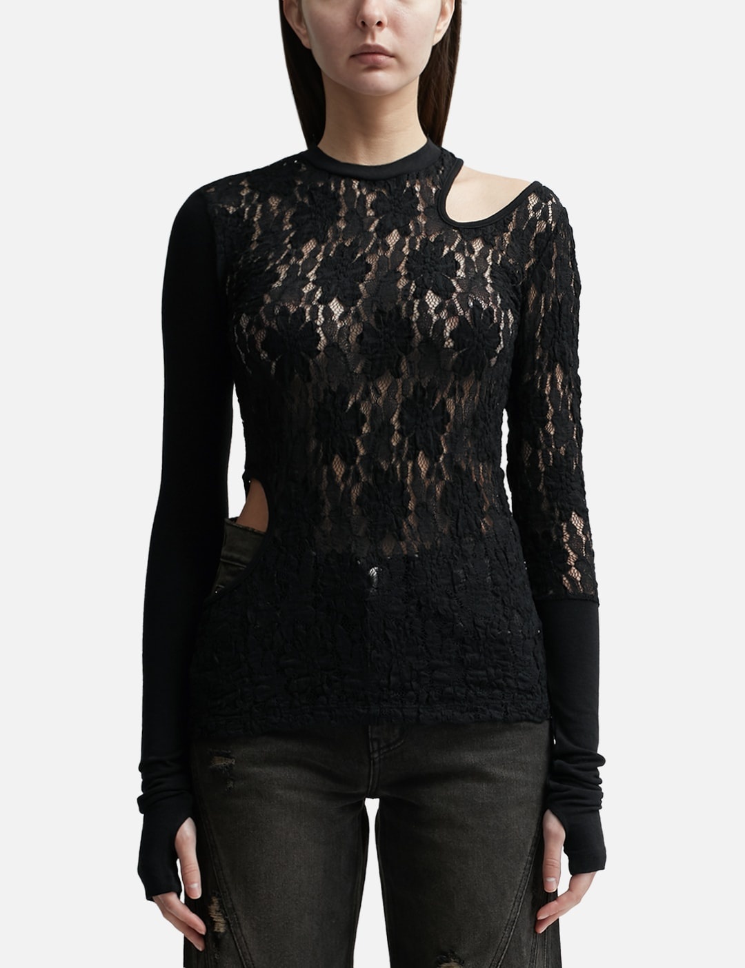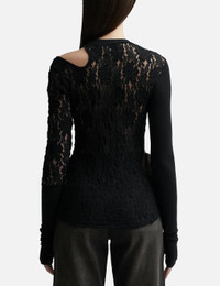 - Lesugiatelier - Cut-Out Floral Paneled Top - Tight fit - Long sleeves - Lace and jersey construction - Ribbed crewneck - Thumbhole - Block design - Cut-out detail on shoulders and waist - Color: Black - Country Of Origin: KR - Material: Shell 1: 60% Rayon, 30% Nylon, 10% Polyurethane; Shell 2: 55% Rayon, 34% Acrylic, 6% Wool, 5% Polyurethane - See more Tops and Clothing SIZING - Model wears size 1 - Model measures: Height 173cm, Chest 32”/81cm, Waist 23’’/58.42cm, Hip 34”/86.4cm