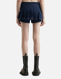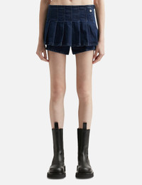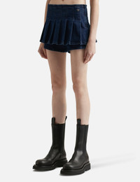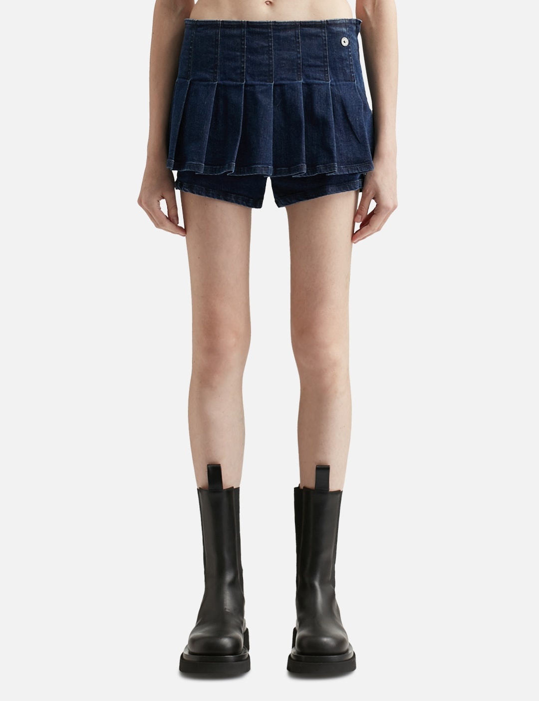 - Lesugiatelier - Denim Pleats Skort - Stretch cotton denim fabric - Size zip closure - Pleated skirt overlay - Color: Dark Blue - Country Of Origin: KR - Material: 97% Cotton, 3% Polyurethane - See more Skirts and Clothing SIZING - Model wears size 1 - Model measures: Height 177cm, Chest 32”/81cm, Waist 23.5”/59.7cm, Hip 33’’/83.8cm