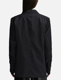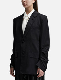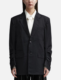 - Lesugiatelier - Drape Jacket - Long sleeves - Notched lapel - Single-breasted - Button closure - Draped pleats on sleeves - Single chest pocket - Two front pockets - Polyester and rayon blend lining - Straight hem - Color: Black - Country Of Origin: KR - Material: Shell: 97% Wool, 3% Polyurethane; Lining: 52% Polyester, 48% Rayon - See more Blazers, Jackets and Clothing SIZING - Model wears size S - Model measures: Height 173cm, Chest 32”/81cm, Waist 23’’/58.42cm, Hip 34”/86.4cm