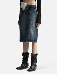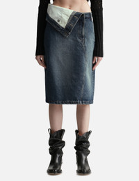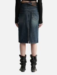 - Lesugiatelier - Folded-waist Denim Midi Skirt - Midi length denim skirt - Asymmetric sash fold design - Design that shows the inside of the pocket on the folded part - Leather logo labeling on the back - Color: Blue - Country Of Origin: KR - Material: 100% Cotton - See more Skirts and Clothing SIZING - Model wears size 1 - Model measures: Height 177cm, Chest 32”/81cm, Waist 23.5”/59.7cm, Hip 33’’/83.8cm