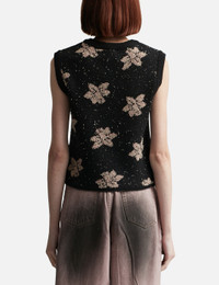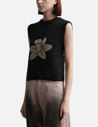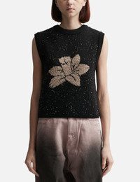 - Lesugiatelier - Merino Wool Blended Flower Vest - Wool-acrylic blend vest - Jacquard flower at center - Ribbed neckline, armhole and hem - Color: Black - Country Of Origin: KR - Material: 65% Merino Wool, 35% Acrylic; 72% Cotton, 28% Acrylic - See more Vests and Clothing SIZING - Model wears size 1 - Model measures: Height 177cm, Chest 32”/81cm, Waist 23.5”/59.7cm, Hip 33’’/83.8cm