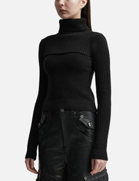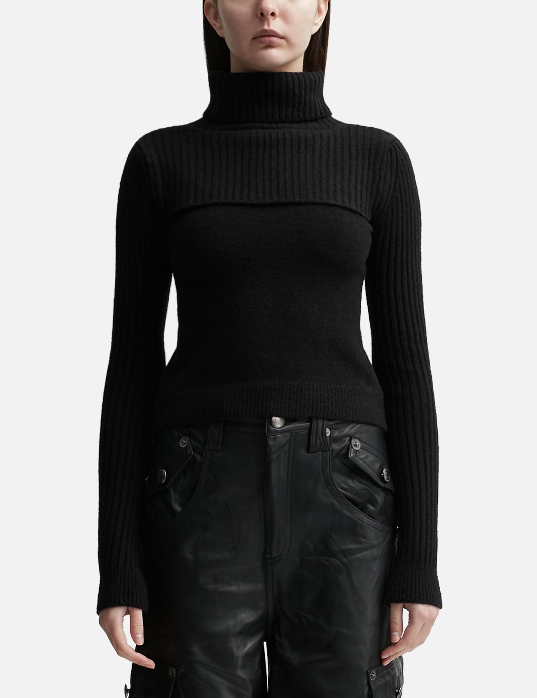 - Lesugiatelier - Missed Wool Bolero Top - Long sleeve - High-neck - Ribbed collar, sleeves, and hem - Cut-out around shoulders - Damaged, torn detailing at front - Silver-tone logo hardware on collar - Straight hem - Color: Black - Country Of Origin: KR - Material: 37% Acrylic, 30% Wool, 30% Nylon, 3% Polyurethane - See more Tops and Clothing SIZING - Model wears size 1 - Model measures: Height 173cm, Chest 32”/81cm, Waist 23’’/58.42cm, Hip 34”/86.4cm