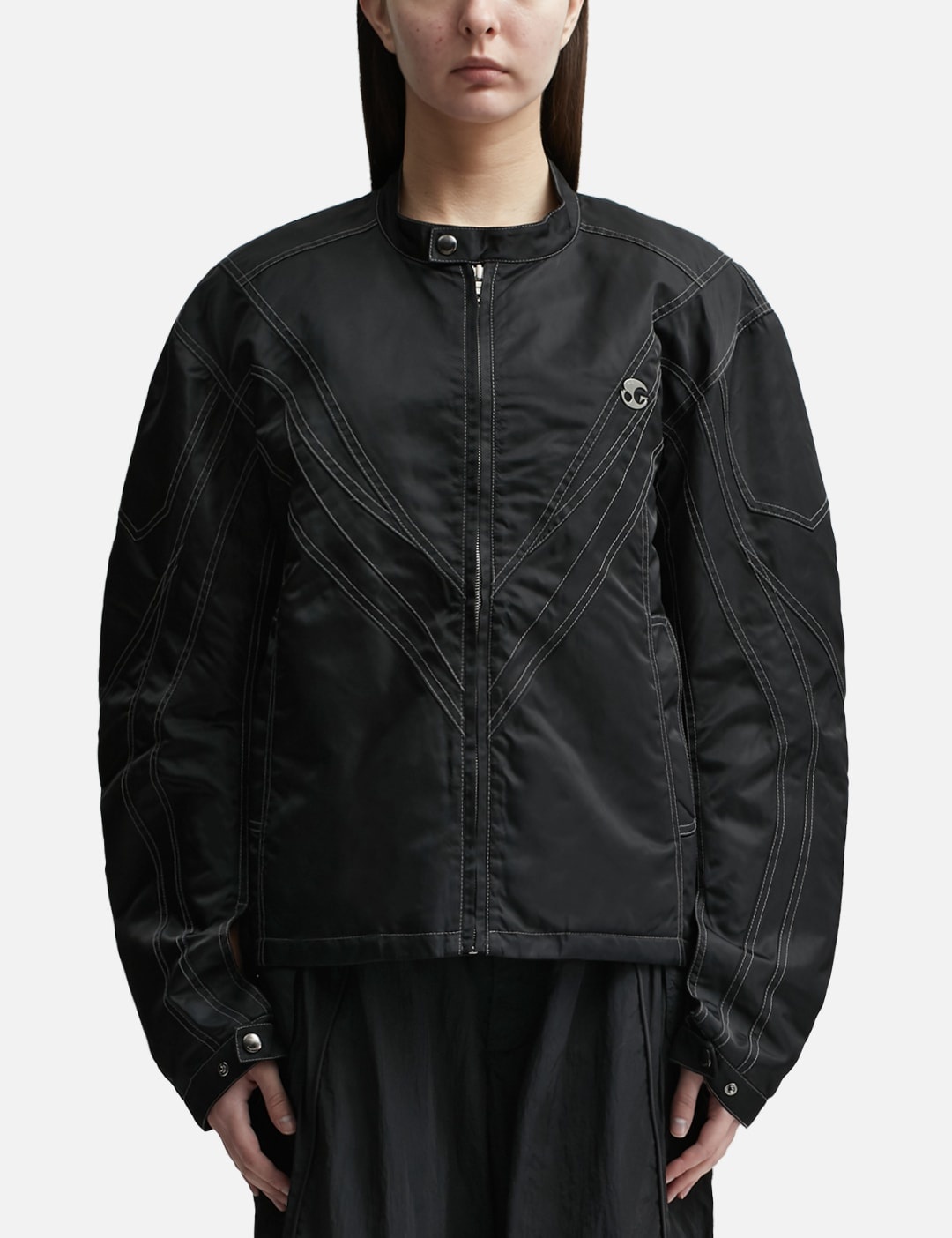 - Lesugiatelier - Moto Biker Jacket - Long sleeves - Zip closure - Snap-button stand collar - Contrast topstitching - Silver-tone logo hardware on chest - Graphic embroidery on rear - Two front pockets - Polyester viscose twill lining - Straight hem - Color: Black - Country Of Origin: KR - Material: Shell: 100% Nylon; Lining: 100% Polyester - See more Jackets and Clothing SIZING - Model wears size L - Model measures: Height 173cm, Chest 32”/81cm, Waist 23’’/58.42cm, Hip 34”/86.4cm