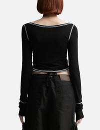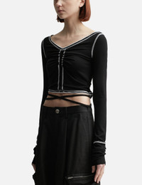 - Lesugiatelier - Shirred Long Sleeve T-shirt - Cropped fit - Stretchy fabric - V-neck - Cut out detailing at front - White trim detailing along neckline, chest, and hem - Shirring decoration on chest - Two long side strings for your styling - Color: Black - Country Of Origin: KR - Material: Rayon 80%, Polyester 20% - See more Tops and Clothing SIZING - Model wears size 1 - Model measures: Height 177cm, Chest 32”/81cm, Waist 23.5”/59.7cm, Hip 33’’/83.8cm