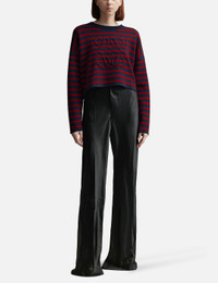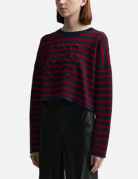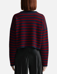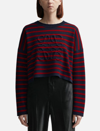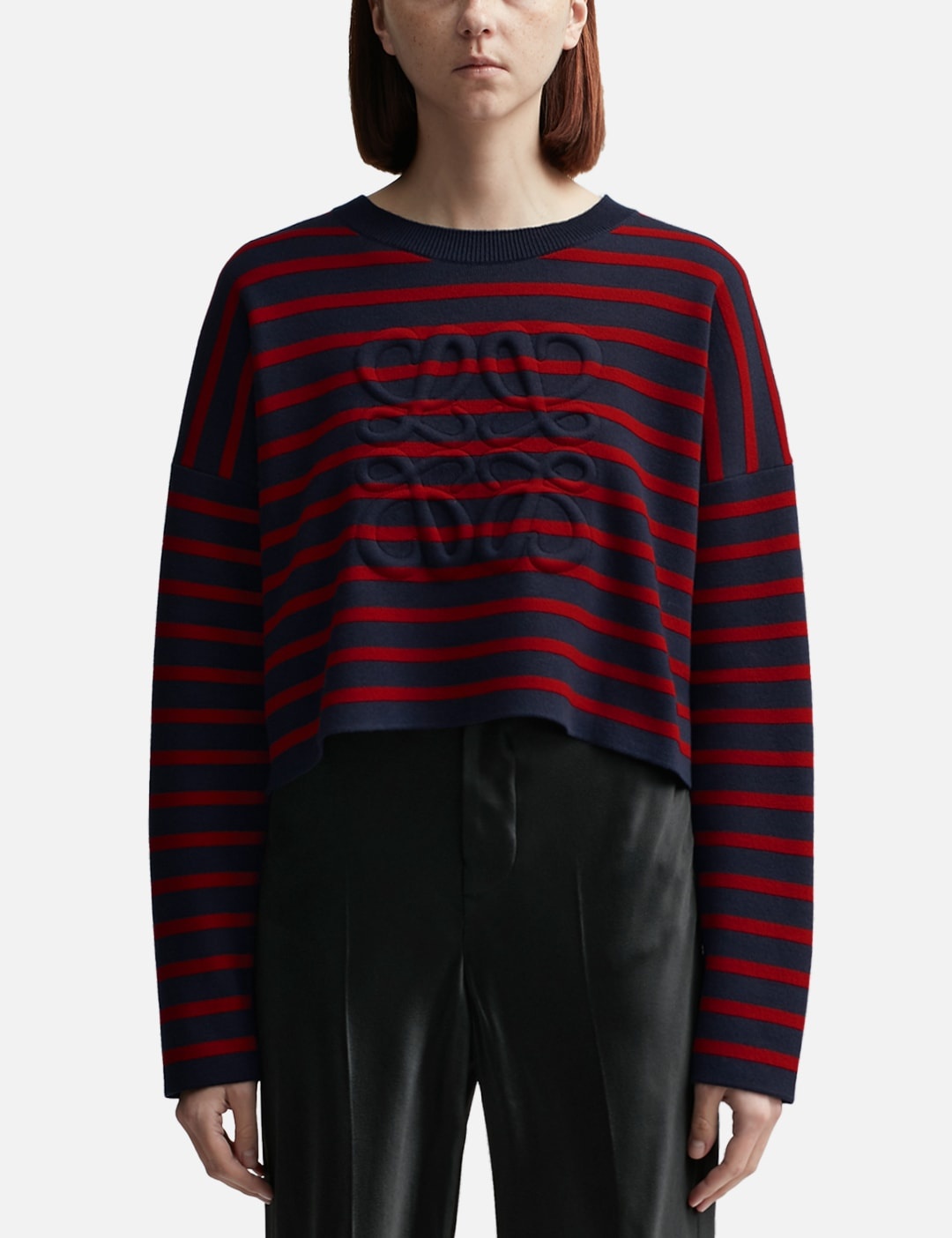 - Loewe - Anagram Sweater - Made of medium-weight compact wool knit - Double-face striped jacquard stitch - Relaxed fit - Long sleeves - Cropped length - Ribbed round neck - Padded 3D Anagram at front - Self-start cuffs and hem - Color: Navy/ Red - Material: Wool - See more Knitwear and Clothing SIZING - Model wears size M - Model measures: Height 177cm, Chest 32"/81cm, Waist 23.5"/59.7cm, Hip 33’’/83.8cm