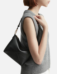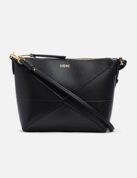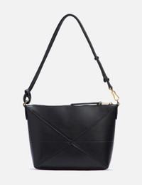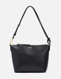 - Loewe - Puzzle Fold Pouch - Shoulder, crossbody or hand carry - Detachable and adjustable strap - Zip closure - Gold embossed brand logo - Suede lining - Color: Black - Material: Shiny Nappa Calf - See more Shoulder Bags, Bags and Accessories SIZING Approximate dimensions: - Height: 15cm - Width: 22cm - Depth: 6cm - Strap Length: 24cm