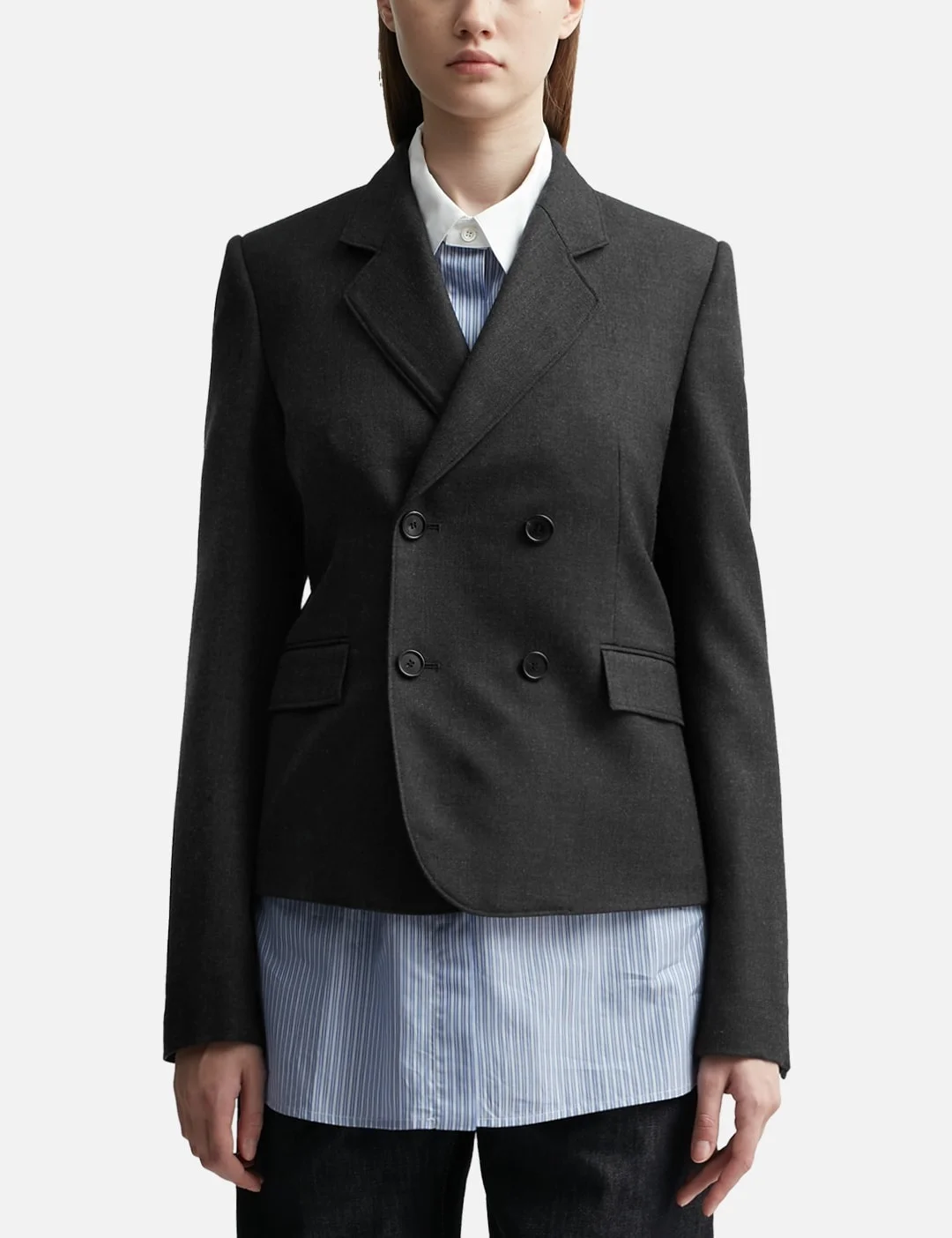 - Loewe - Short Wool Jacket - Double-breasted jacket - Button closure - Lapel collar - Two front pockets - Fully lined - Short hem - Color: Anthracite Melange - Material: 100% Wool - See more Jackets and Clothing SIZING - Model wears size 36 - Model measures: Height 180cm, Chest 33’’/84cm, Waist 23’’/58.42cm, Hip 36’’/91cm