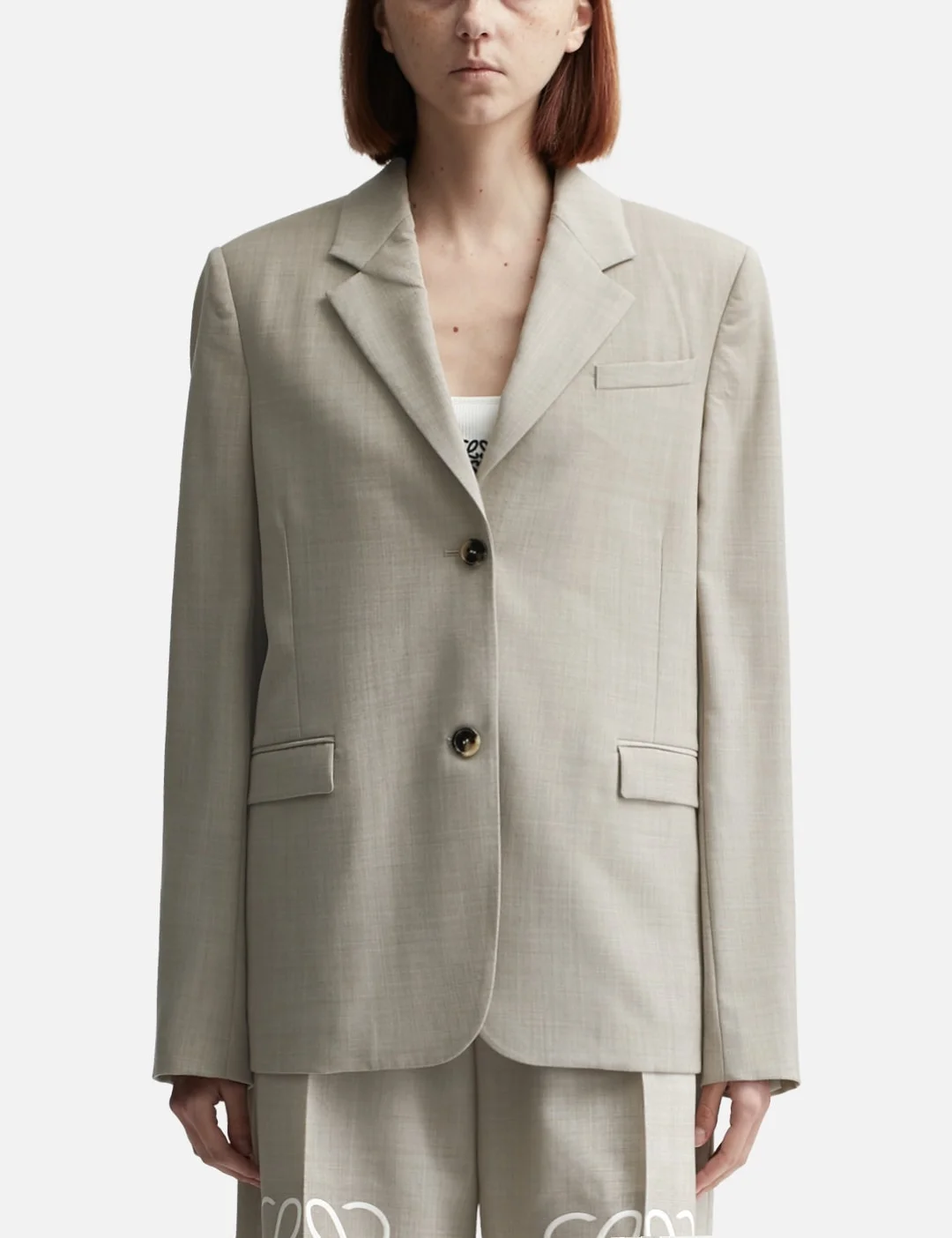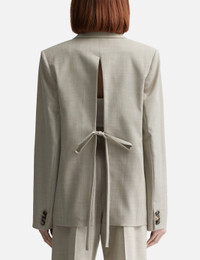 - Loewe - Tailored Jacket - Made with lightweight melange wool - Notch lapel - Button closure - Deep rear center slit with ribbon detail - Fully lined - Color: Light Beige Melange - Material: Wool - See more Jackets and Clothing SIZING - Model wears size 36 - Model measures: Height 177cm, Chest 32”/81cm, Waist 23.5”/59.7cm, Hip 33’’/83.8cm