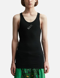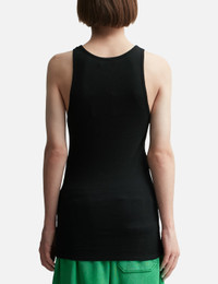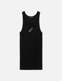 - LUU DAN - Logo Tank Top - Made of lightweight rib cotton jersey - Fitted - Logo embroidery at front - Ribbed collar and armhole - Color: Black - Material: 100% Cotton - See more Tanks and Clothing SIZING - Model wears size M - Model measures: Height 184cm, Chest 29"/73cm, Waist 24"/62cm, Hip 35"/90cm