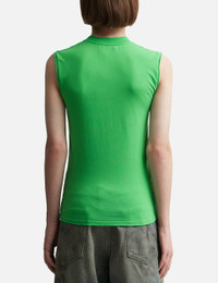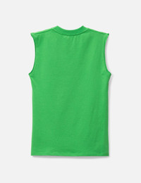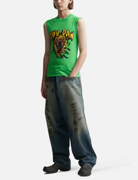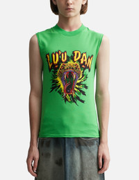 - LUU DAN - Sleeveless Tee - Ribbed crewneck - Raw cut and rolled armhole - Snake blast graphic print on front - Color: Lizard Green - Material: 67% Cotton, 29% Polyester, 4% Elastane - See more Tanks and Clothing SIZING - Model wears size M - Model measures: Height 184cm, Chest 29"/73cm, Waist 24"/62cm, Hip 35"/90cm