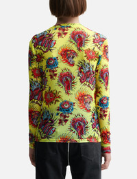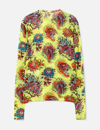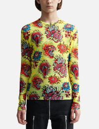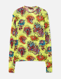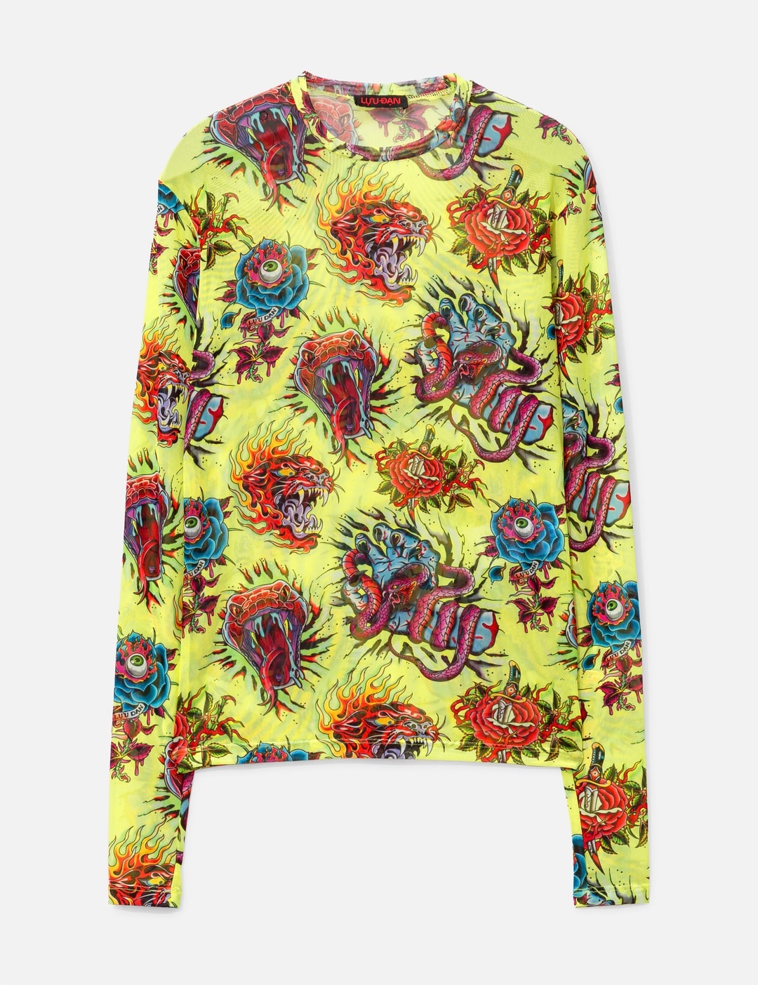 - LUU DAN - Unisex Mesh Long-sleeve Top - Tight fit - Round neck - Long sleeves - Allover 'tatted' print - Color: Yellow - Material: 92% Cotton, 8% Elastane - See more Tops and Clothing SIZING - Model wears size M - Model measures: Height 184cm, Chest 29"/73cm, Waist 24"/62cm, Hip 35"/90cm