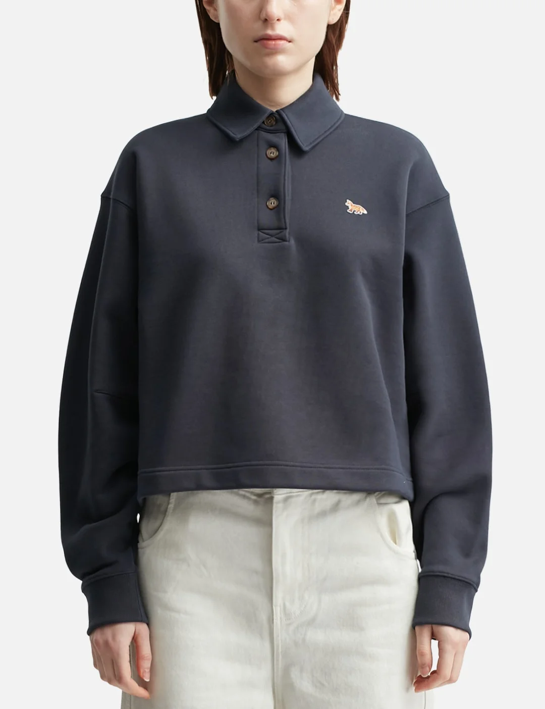 - Maison Kitsune - Baby Fox Cropped Polo Sweatshirt - Made in plain fleece - Polo-style sweatshirt - Cropped fit - Polo collar with button placket - Long sleeve - Baby Fox embroidered patch on the chest - Ribbed collar, cuffs and hem - Color: Classic Navy - Material: 100% Cotton - See more Sweatshirts and Clothing - Model wears size S - Model measures: Height 177cm, Chest 31.9’’/81cm, Waist 23.6’’/60cm, Hip 35.8’’/91cm - Vendor Code: PW00200KM0341