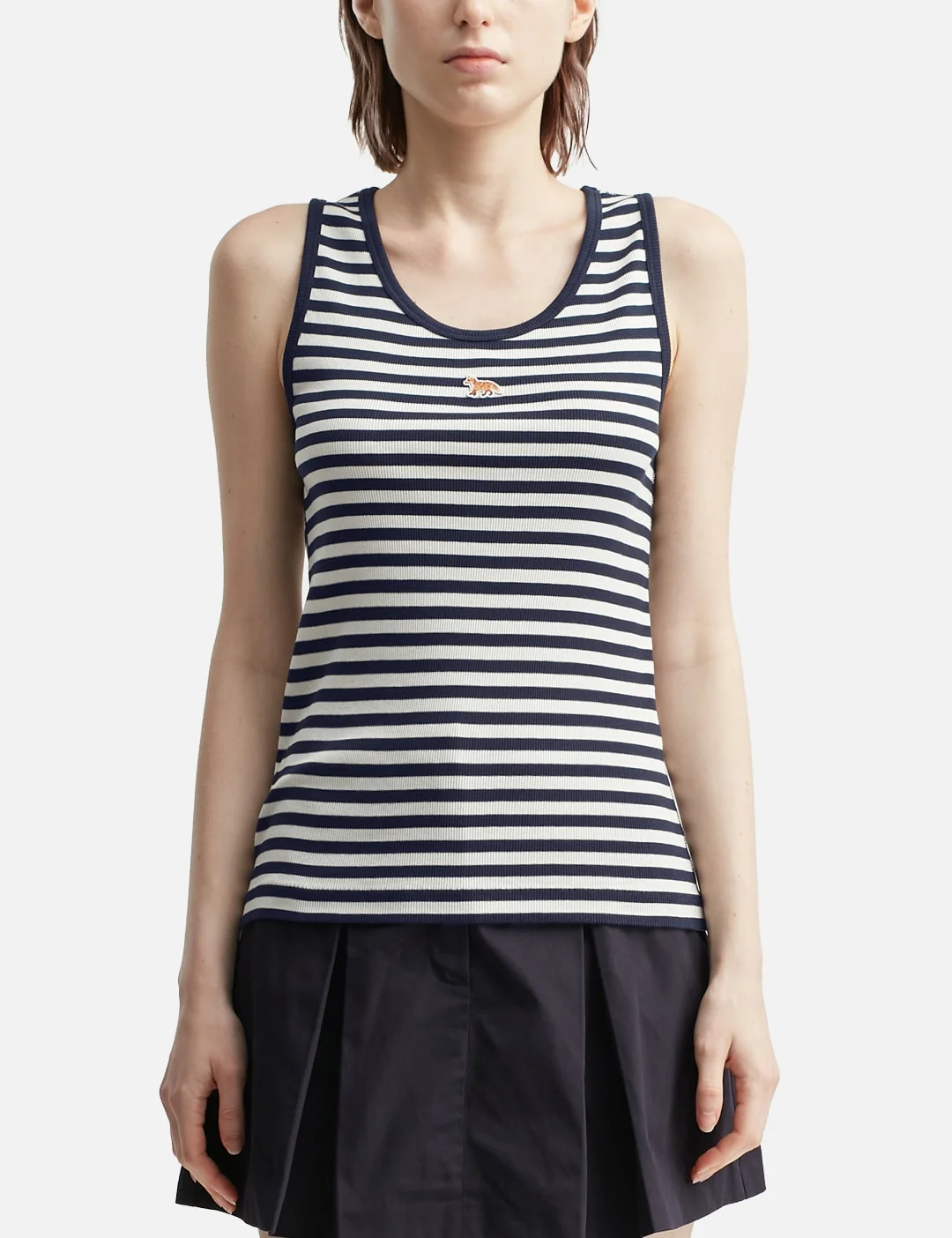 - Maison Kitsune - Baby Fox Striped Tank Top - Striped ribbed cotton fabric - Fitted fit - Scoop neckline - Baby Fox embroidered patch at chest - Color: Dark Navy/ Parchment White - Material: 100% Cotton - See more Tanks and Clothing - Model wears size S - Model measures: Height 177cm, Chest 31.9’’/81cm, Waist 23.6’’/60cm, Hip 35.8’’/91cm - Vendor Code: PW00619KJ7033