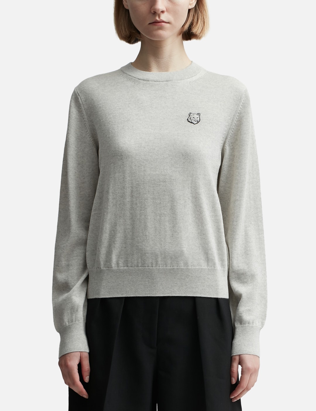 - Maison Kitsuné - Bold Fox Head Patch Regular Jumper - Merino wool jumper - Classic cut - Crewneck - Long sleeves - Ribbing at the cuffs, neckline, and waist - Bold Fox Head patch at the chest - Plain back - Color: Light Grey Melange - Material: 100% Laine - See more Knitwear and Clothing SIZING - Model wears size S - Model measures: Height 179cm, Chest 32”/81cm, Waist 23’’/58.42cm, Hip 35’’/88.9cm