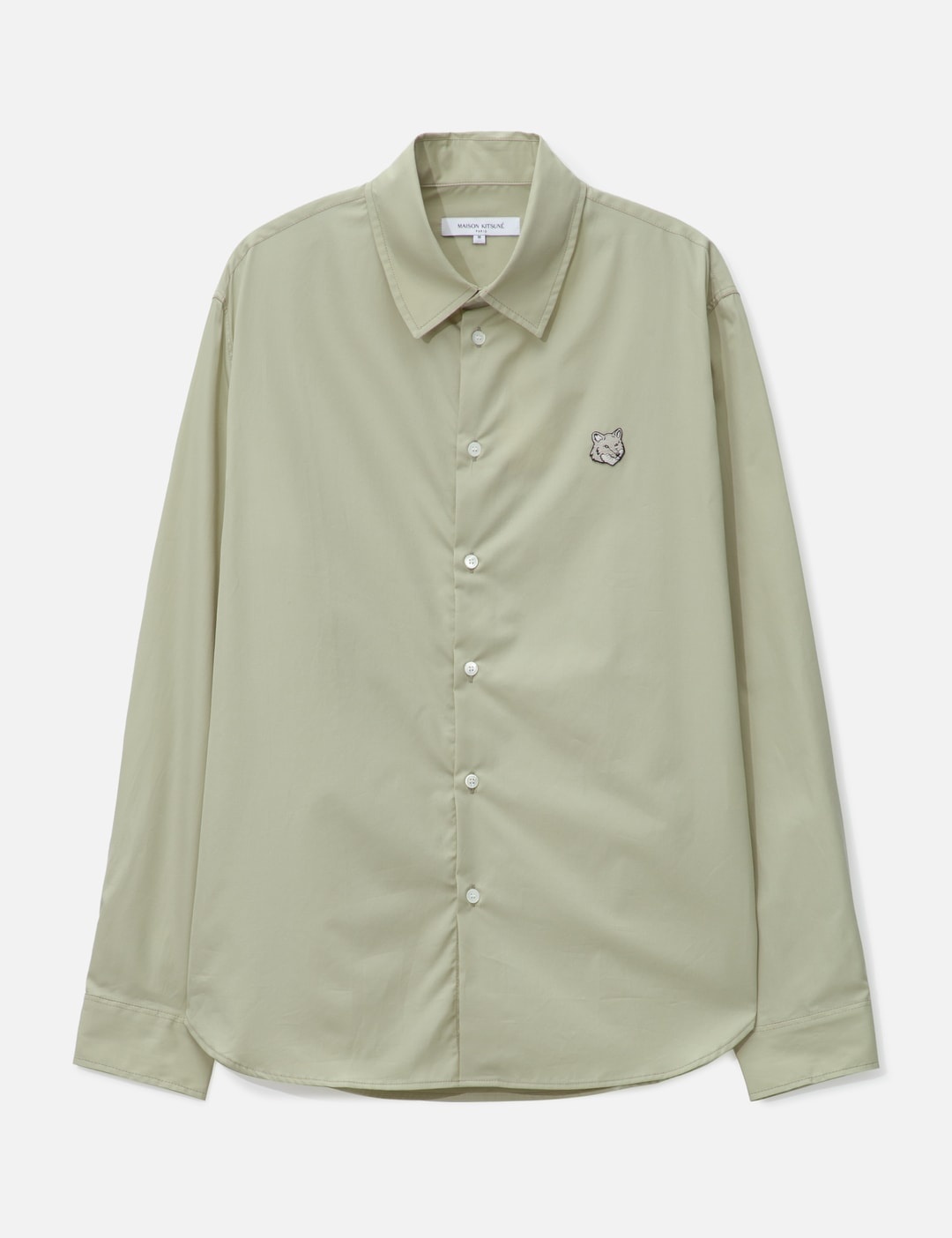 - Maison Kitsune - Bold Fox Head Relaxed Shirt - Cotton poplin fabric - Button closure - Tonal bold Fox Head embroidered at chest - Curved hem - Color: Ash Tree - Material: 100% Cotton - See more Shirts and Clothing SIZING - Model wears size M - Model measures: Height 189cm, Chest 31.5"/80cm, Waist 27”/69cm, Hip 34.3’’/87cm