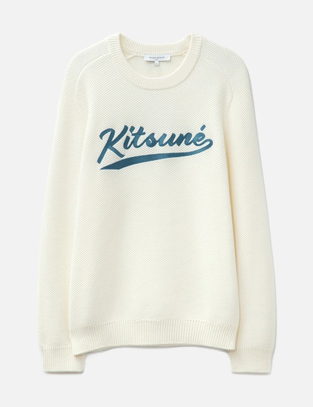 - Maison Kitsune - Kitsune Varsity Embroidered Mesh Jumper - Textured knit construction - Contrasting embroidered logo at center - Long, raglan sleeves - Ribbed crewneck, cuffs, and hem - Color: Milk - Material: 70% Cotton, 30% Polyamide - See more Knitwear and Clothing - Model wears size L - Model measures: Height 186cm, Chest 34”/86cm, Waist 28”/71cm, Hip 36”/91cm - Model wears size S - Model measures: Height 177cm, Chest 31.9’’/81cm, Waist 23.6’’/60cm, Hip 35.8’’/91cm - Vendor Code: OM00808KT1137P204