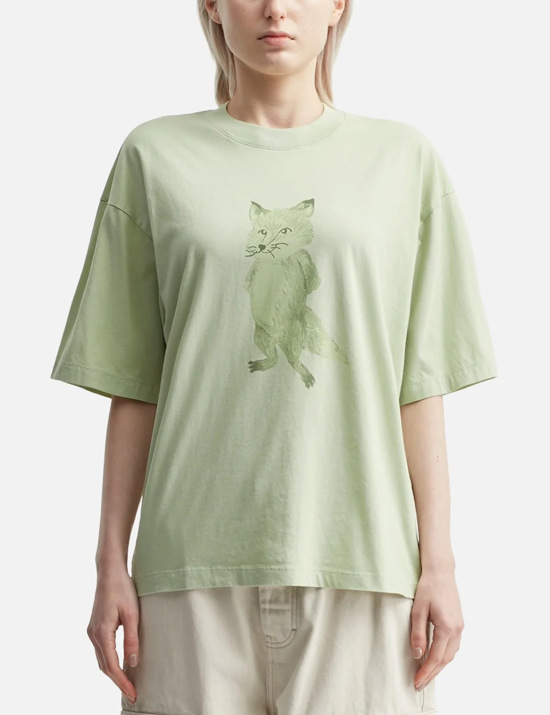 - Maison Kitsune - Lady Fox Boxy T-shirt - Cotton jersey fabric - Boxy fit - Large Lady Fox graphic print at front - Straight hem - Color: Laurel Green - Material: 100% Cotton - See more T-Shirts and Clothing - Model wears size S - Model measures: Height 177cm, Chest 31.9’’/81cm, Waist 23.6’’/60cm, Hip 35.8’’/91cm - Vendor Code: OW00119KJ00080171