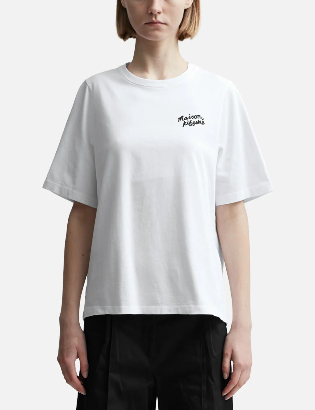 - Maison Kitsune - Maison Kitsune Handwriting Comfort T-shirt - Comfort cut - Ribbed crewneck - Short sleeves - Reinforced seams at the sleeves and waist - Maison Kitsune Handwriting embroidered at the chest - Color: White/Black - Material: 100% Cotton - See more T-Shirts and Clothing - Model wears size S - Model measures: Height 178cm, Chest 30’’/76.2cm, Waist 23”’/58.4cm, Hip 34.5’’/87.6cm - Vendor Code: MW00126KJ0119M186