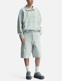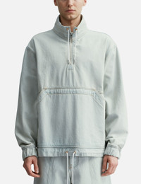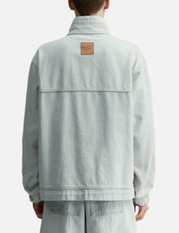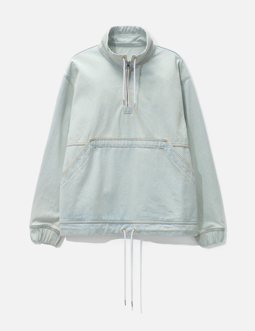- Maison Kitsuné - Popover Denim Jacket - Straight cut - Relaxed fit - High drawstring collar with zipper - Drawstring waist - Brand handwriting leather patch at the back - Color: Bleached indigo - Material: 100% Cotton - See more Jackets and Clothing SIZING - Model wears size M - Model measures: Height 186cm, Chest 34”/86cm, Waist 28”/71cm, Hip 36”/91cm