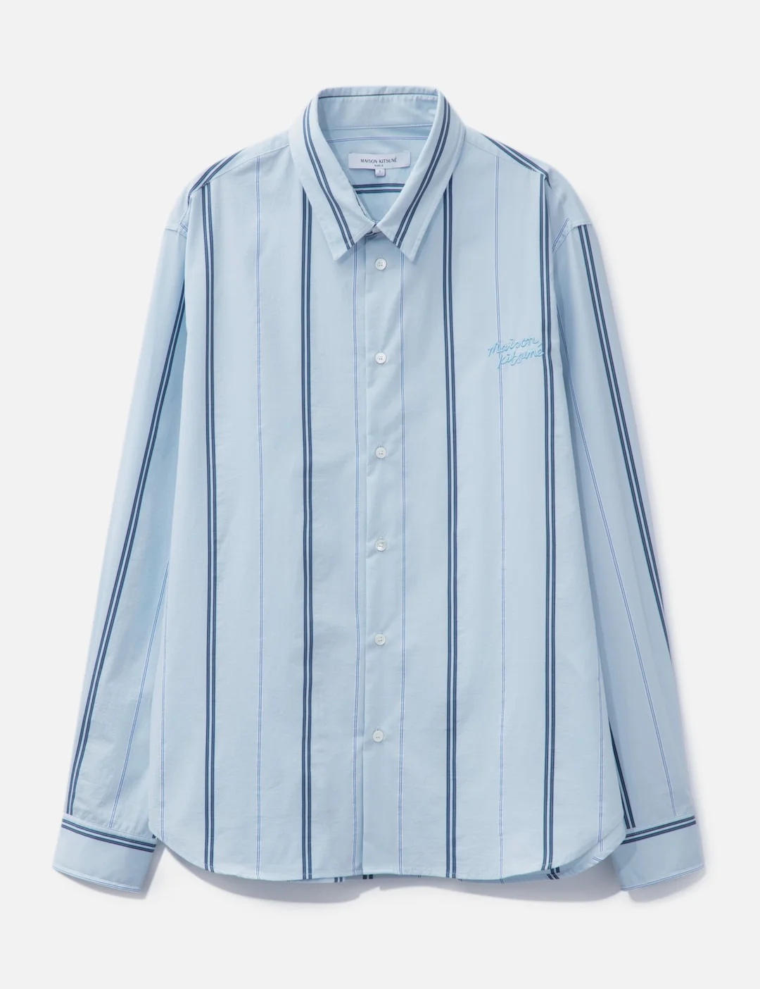 - Maison Kitsune - Relaxed Shirt - Cotton-nylon blend fabric - All-over heritage stripes - Button closure - Embroidered logo at chest - Curved hem - Color: Cirrus Blue - Material: 85% Cotton, 15% Polyamide - See more Shirts and Clothing - Model wears size L - Model measures: Height 186cm, Chest 34”/86cm, Waist 28”/71cm, Hip 36”/91cm - Vendor Code: MM00403WC50290072
