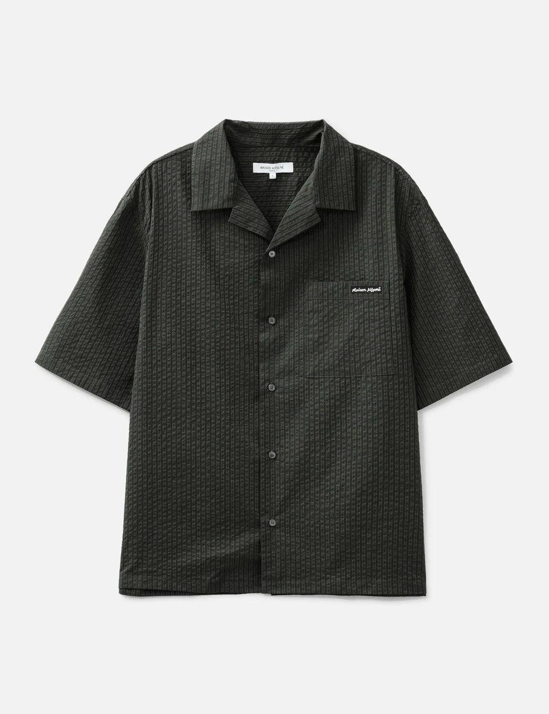 - Maison Kitsune - Resort Shirt - Boxy cut - Spread collar - Front button closure - Short sleeves - Patch chest pocket - Maison Kitsune Handwriting signature woven label applied on the chest - Color: Ranger Green - Material: 74% Polyester, 26% Cotton - See more Shirts and Clothing - Model wears size L - Model measures: Height 186cm, Chest 34”/86cm, Waist 28”/71cm, Hip 36”/91cm - Vendor Code: OM00421WC5032P391