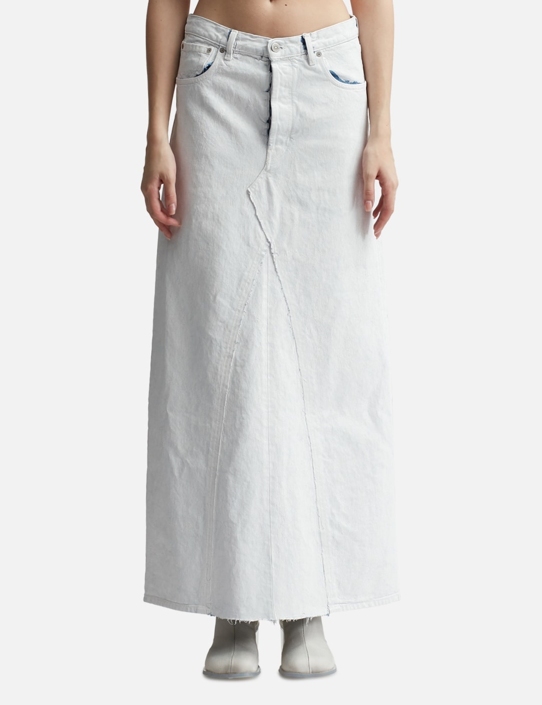 - Maison Margiela - Denim Skirt - White paint treatment - Belt loop - Button fly - Classic five pockets - White stitching at the back - Back slit - Made in Italy - Color: White Paint - Material: 100% Cotton - See more Skirts and Clothing SIZING - Model wears size 40 - Model measures: Height 181cm, Chest 33”/84cm, Waist 24”/61cm, Hip 35”/90cm