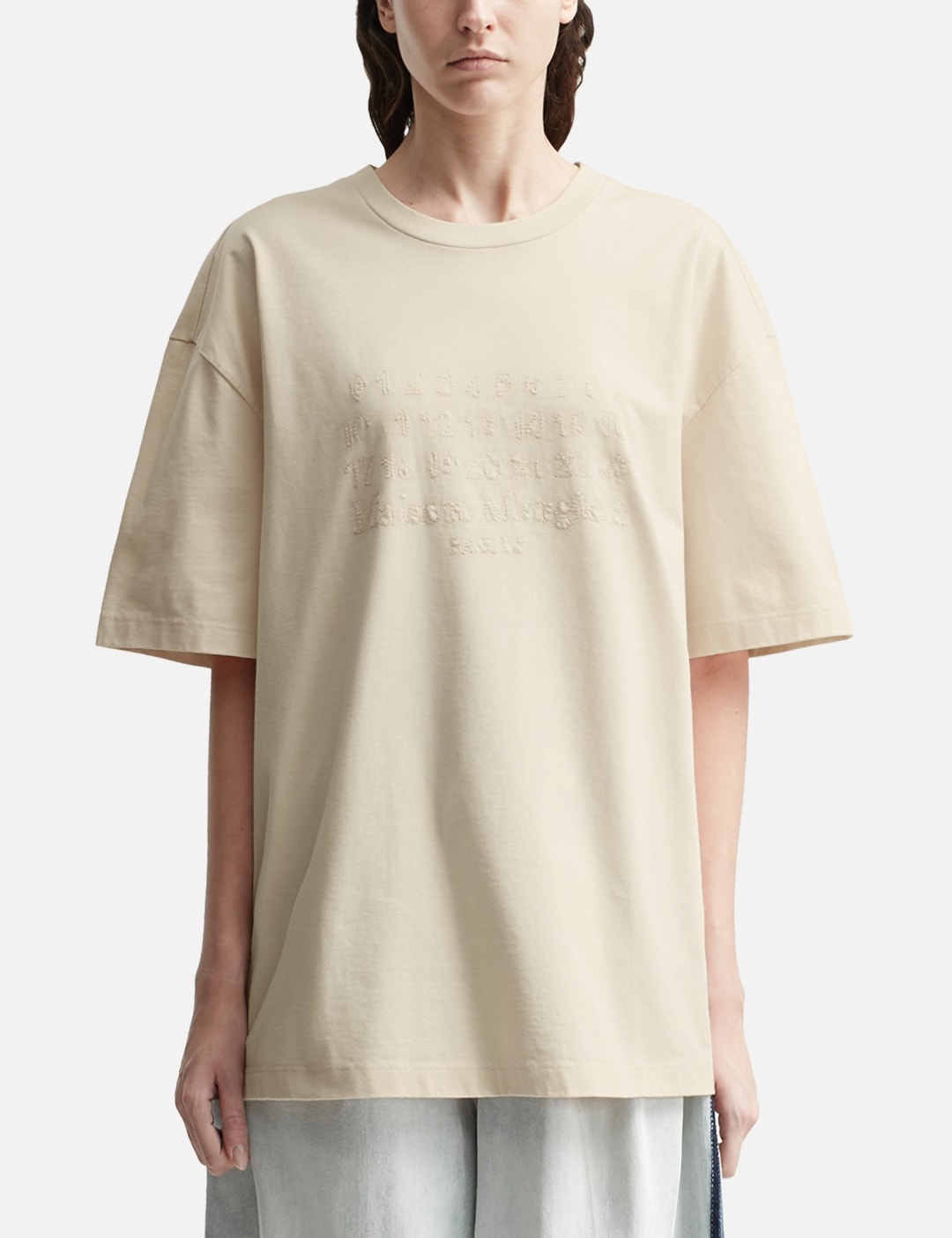 - Maison Margiela - Embroidered Logo T-Shirt - Heavy cotton jersey T-shirt - Ribbed crewneck - Short sleeves - Reverse embroidery logo at front - Four stitches at the back - Color: Pink Beige - Material: 100% Cotton - See more SS T-Shirts, T-Shirts and Clothing SIZING Male - Model wears size M - Model measures: Height 189cm, Chest 31.5"/80cm, Waist 27”/69cm, Hip 34.3’’/87cm - Model wears size S - Model measures: Height 175cm, Chest 32’/81cm, Waist 24.5’’/61.2cm, Hip 35’’/88.9cm