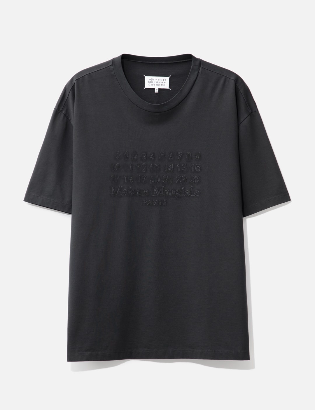 - Maison Margiela - Embroidered Logo T-Shirt - Heavy cotton jersey T-shirt - Ribbed crewneck - Short sleeves - Reverse embroidery logo at front - Four stitches at the back - Color: Washed Black - Material: 100% Cotton - See more SS T-Shirts, T-Shirts and Clothing SIZING Male - Model wears size M - Model measures: Height 189cm, Chest 31.5"/80cm, Waist 27”/69cm, Hip 34.3’’/87cm - Model wears size S - Model measures: Height 175cm, Chest 32’/81cm, Waist 24.5’’/61.2cm, Hip 35’’/88.9cm