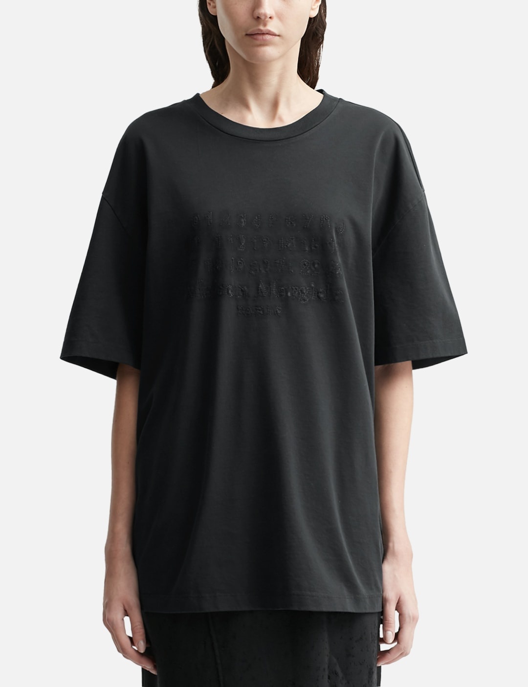 - Maison Margiela - Embroidered Logo T-Shirt - Heavy cotton jersey T-shirt - Ribbed crewneck - Short sleeves - Reverse embroidery logo at front - Four stitches at the back - Color: Washed Black - Material: 100% Cotton - See more SS T-Shirts, T-Shirts and Clothing SIZING Male - Model wears size M - Model measures: Height 189cm, Chest 31.5"/80cm, Waist 27”/69cm, Hip 34.3’’/87cm - Model wears size S - Model measures: Height 175cm, Chest 32’/81cm, Waist 24.5’’/61.2cm, Hip 35’’/88.9cm