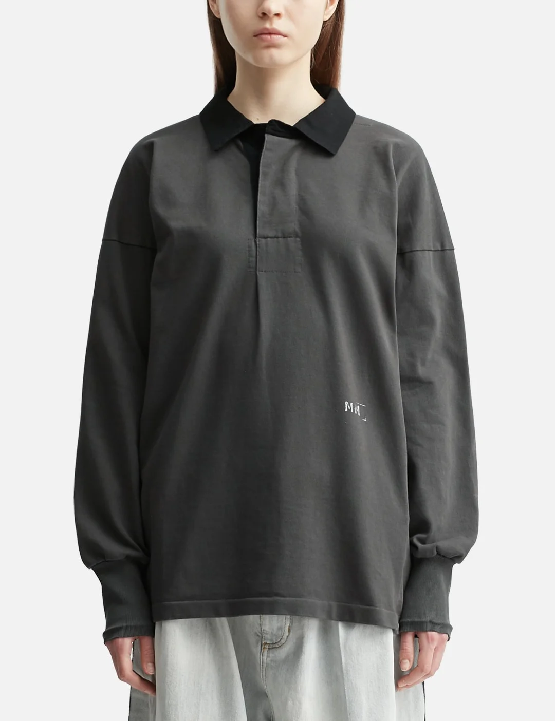 - Maison Margiela - Long Sleeve Polo Shirt - Washed cotton fabric - Contrast classic polo collar - Button placket - Intentionally frayed logo print at front - Ribbed cuffs - Signature 4-stitch collar at rear - Straight hem - Color: Anthracite - Material: 100% Cotton - See more Polos and Clothing - Model wears size M - Model measures: Height 186cm, Chest 34”/86cm, Waist 28”/71cm, Hip 36”/91cm - Vendor Code: S51GL0056M20096860