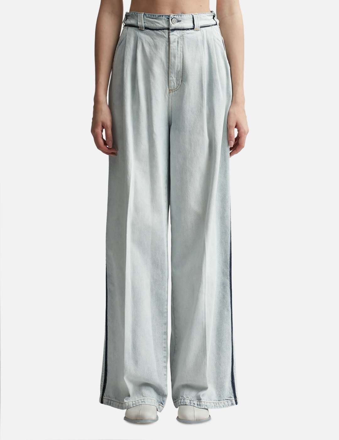 - Maison Margiela - Memory Of Oversized Jeans - Made of 12 oz Japanese denim with icy wash - Loose fit - Elasticated waistband at the back - Belt loops - Zip fly with hook and button closure - Two side pockets - Two rear pockets - Four stitches at the back - Wide leg - Made in italy - Color: Light Blue - Material: 100% Cotton; Pocket Lining: 65% Polyester, 35% Cotton - See more Jeans and Clothing SIZING - Model wears size 40 - Model measures: Height 181cm, Chest 33”/84cm, Waist 24”/61cm, Hip 35”/90cm