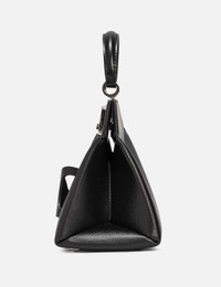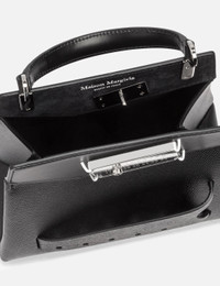 - Maison Margiela - Snatched Handbag Small - Made of grainy calf leather and smooth calf leather - Polished metal hardware - Detachable and adjustable leather shoulder strap - Top handle - Front logo closure - Front handle - Inner flat pocket - Inner logo stamping - Metal feet - Polyester lining - Made in Italy - Color: Black - Material: Calf leather; Lining: Polyester - See more Bags and Accessories SIZING Approximate dimensions: - Height: 16cm - Width: 20cm - Depth: 11cm - Handle Length: 7.5cm - Strap Length: 30cm